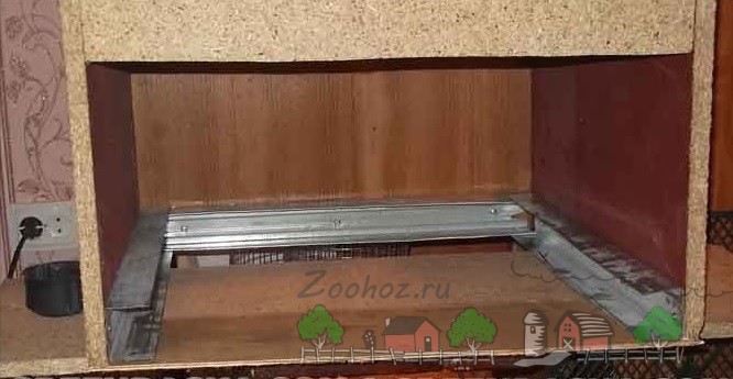 - Пол брудера делаем из двух частей: основного и съемного поддона, который крепится к коробу. Основное дно затягиваем сеткой с мелкой ячейкой, а для поддона вырезаем каркас и прикрепляем лист пластика или оцинкованного железа. Такие материалы помогут поддерживать гигиену прибора.