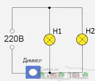- Если будете использовать две лампы, предлагаем схему подключения (смотрите фото). В этом случае лампы соединяем параллельно. Даже если перегорит одна, останется гореть вторая лампа.